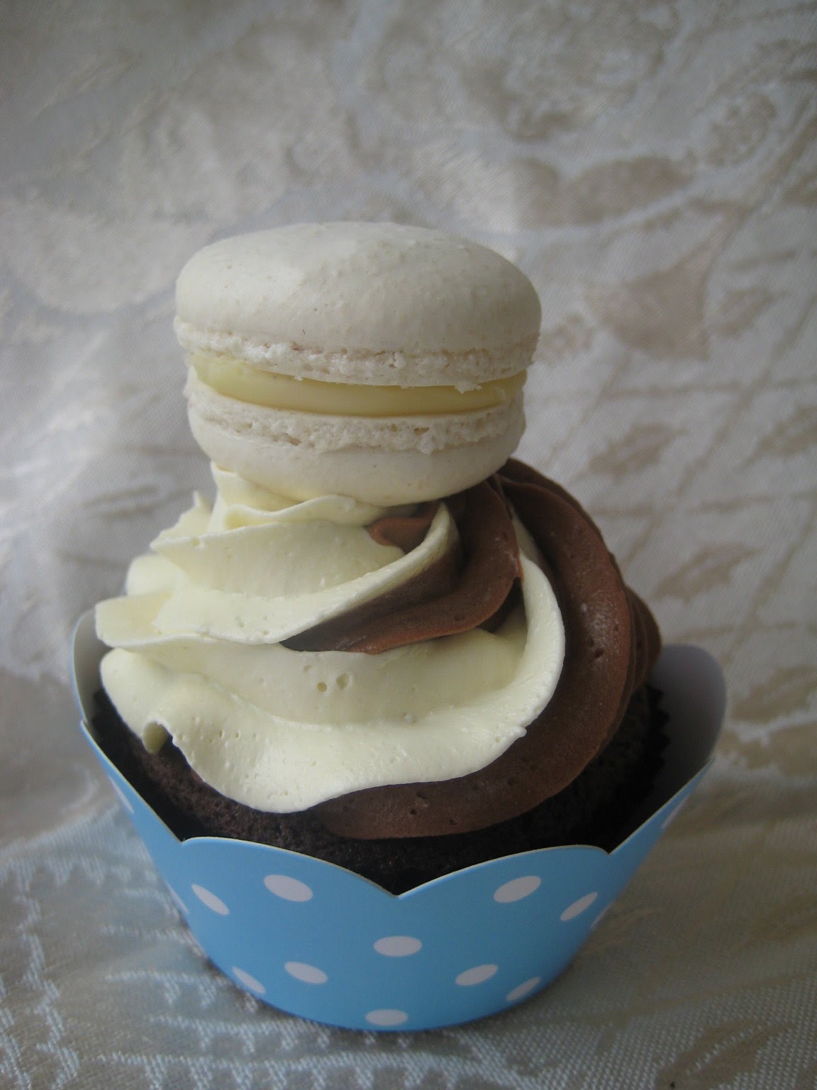 MacCakes - no this isn't something you get at the golden arches. It's what I'm calling my cupcakes topped with macarons that were a result of some yummy leftovers this week.