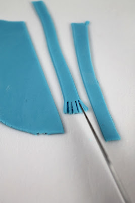 Make the scarf by rolling out some more of the fondant and using the sharp knife cut out 2 strips around .5cm wide and 3-4cm long. At one end using the sharp knife to cut a fringe around .5cm long with about 4 to 5 pieces as per the picture.
