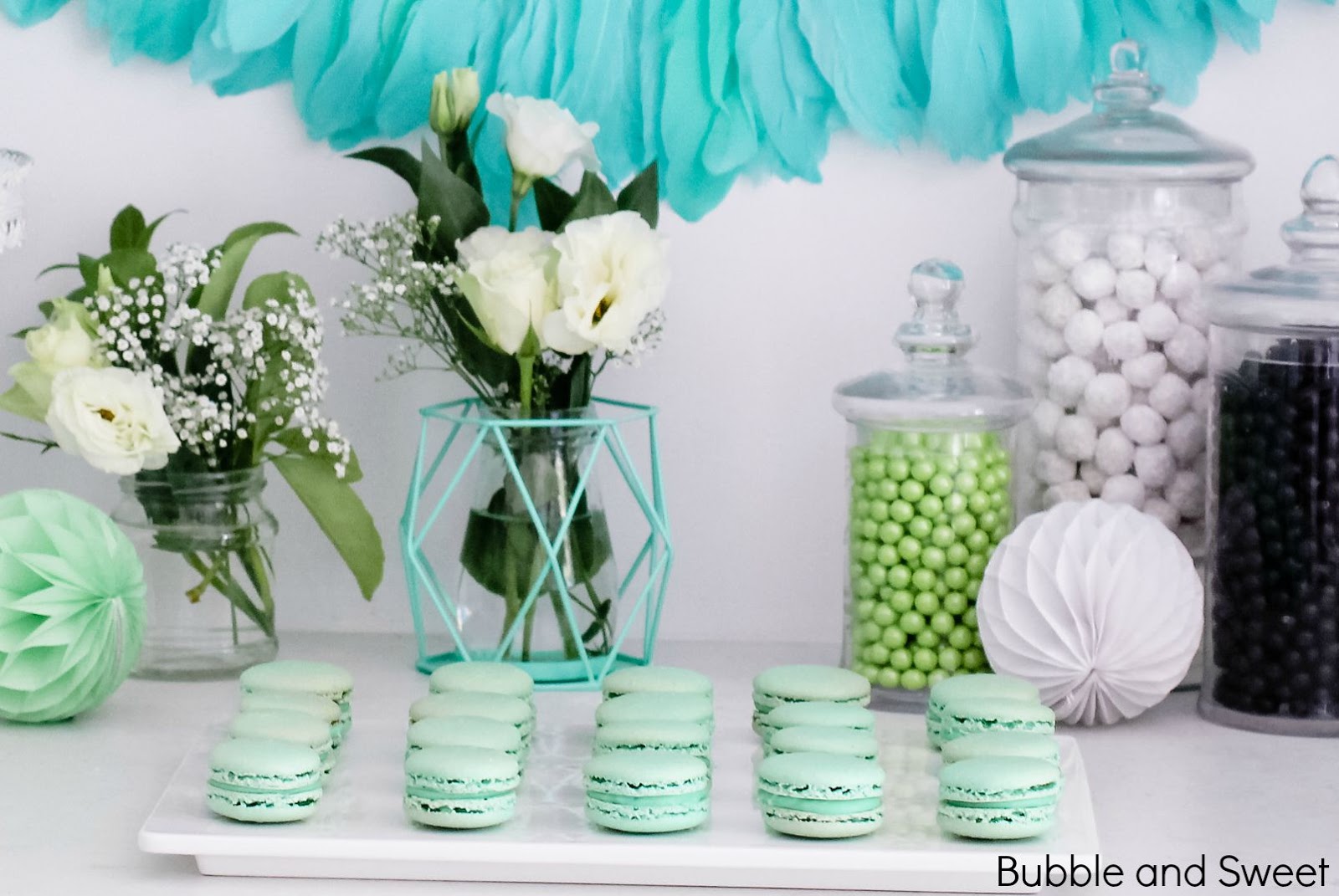 Macarons in a matching mint shade (CLICK HERE FOR MY MACARON RECIPE) for the party table and as I made them myself I was able to make a variety of sizes to decorate the cake with.