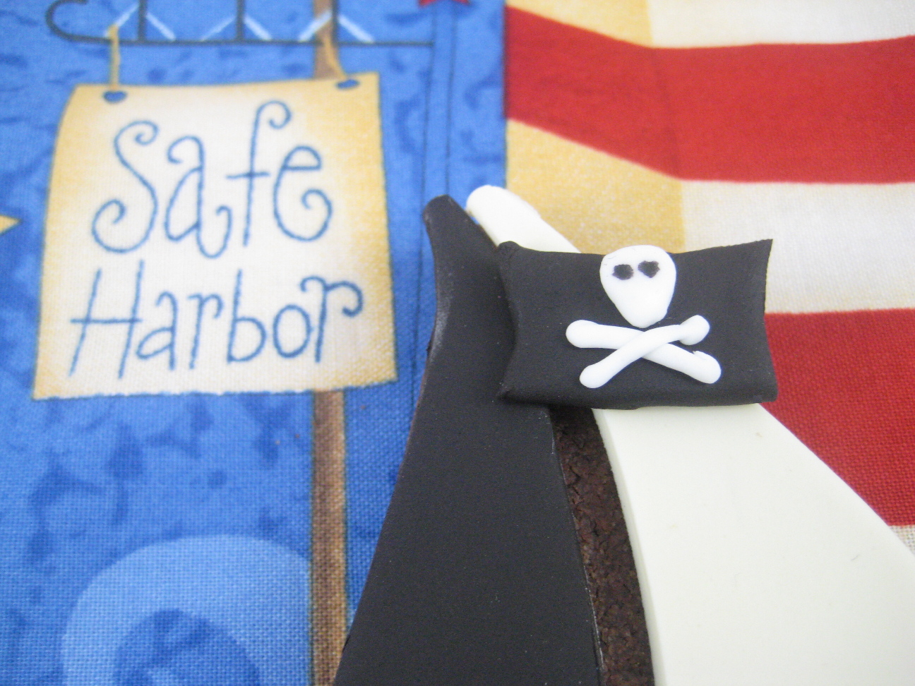 To make the pirate flag I cut out a rectangle and shaped little teensy skull and crossbones.....but while I was doing it I was thinking it might be easier to cut out a white flag and draw a black skull and crossbones on with edible pen.